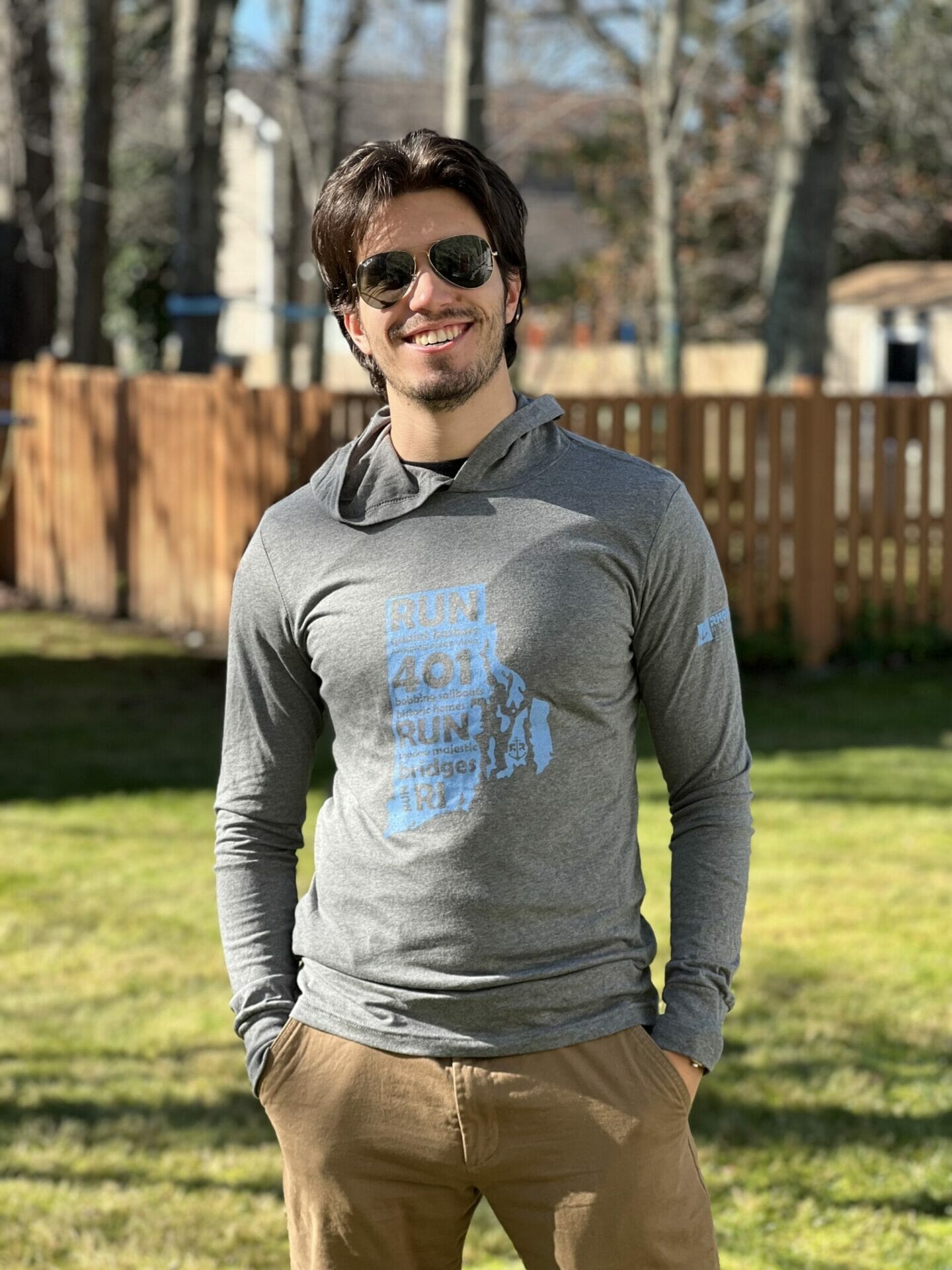 A soft and lightweight pullover that speaks to the joy of running in the Ocean State.  With references to the state-wide area code, to call-outs of sights, you can see while running in beautiful Rhode Island.